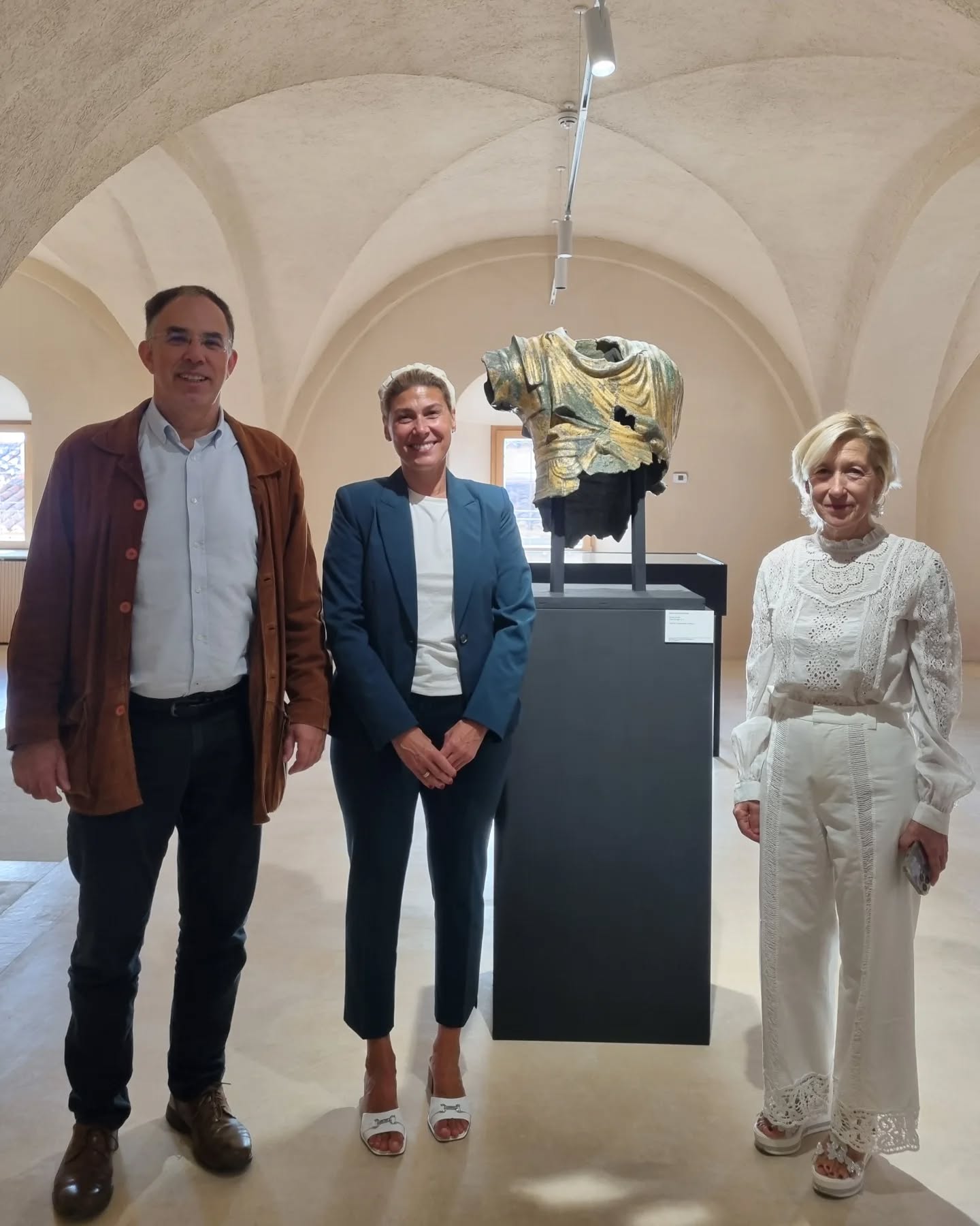 Na foto: António Carvalho, Diretor do MNA, Raquel Preciados, Diretora do Museo de Cáceres, e Agustina Cantero, Historiadora de Arte e Conservadora do Museo de Cáceres, acompanhados de um torso de uma estátua equestre que integrou a exposição “Lusitânia Romana: Origem de Dois Povos / Lusitania Romana. Origen de dos Pueblos” (2016, co-organização do Museu Nacional de Arqueologia e do Museu Nacional de Arte Romano de Mérida).