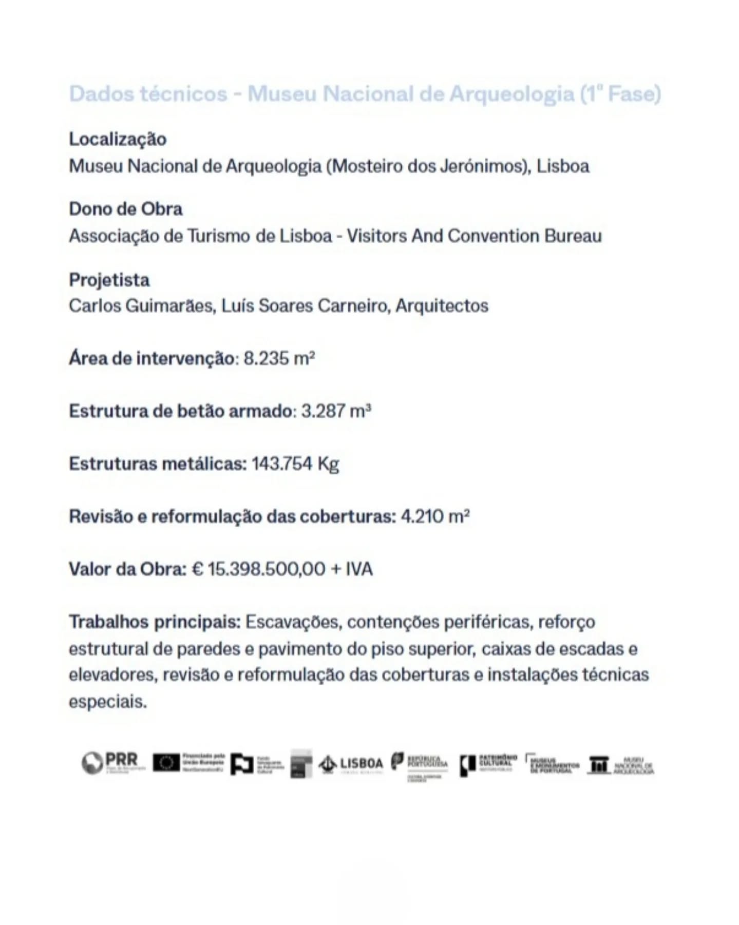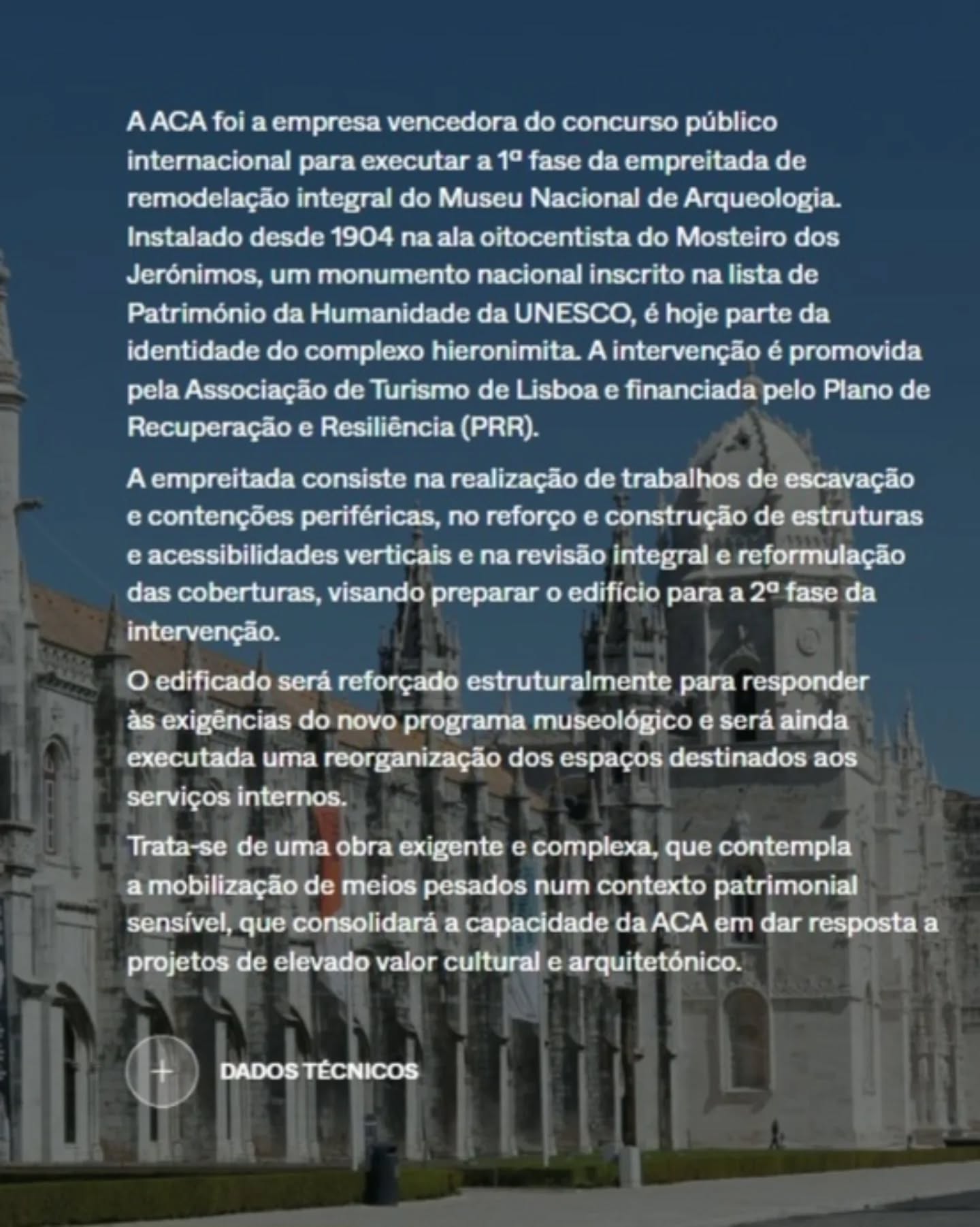 O Museu Nacional de Arqueologia surge em destaque na comunicação institucional da ACA, a empresa vencedora do concurso internacional para realização da 1.ª fase da empreitada da obra de remodelação integral dos espaços ocupados pelo MNA. Os trabalhos a desenvolver contemplam escavações, contenções periféricas, reforço estrutural de paredes e do pavimento do piso superior, caixas de escadas e elevadores, revisão e reformulação das coberturas e instalações técnicas especiais. Esta intervenção soma um valor de € 15.398.500,00 + IVA e decorre até Junho de 2026.